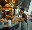 Street with stalls serving popular street foods